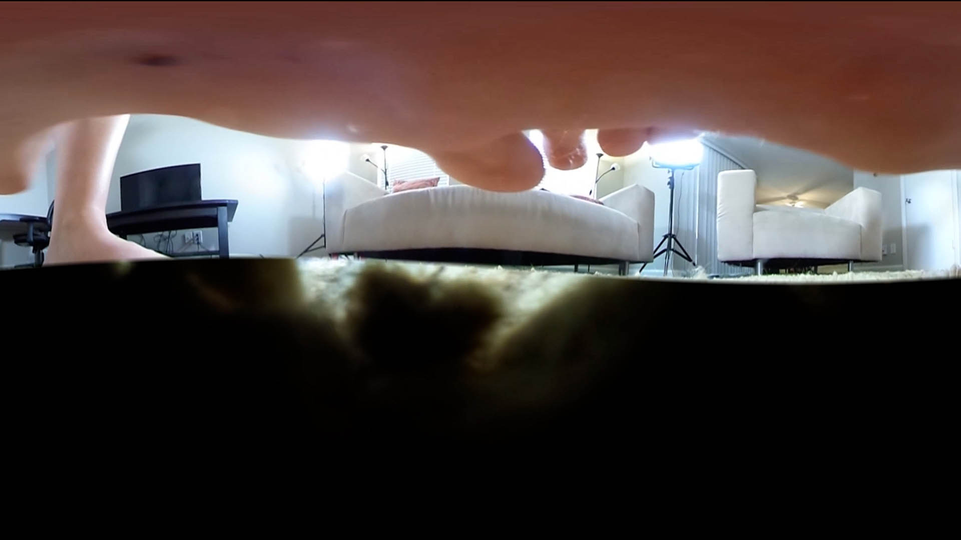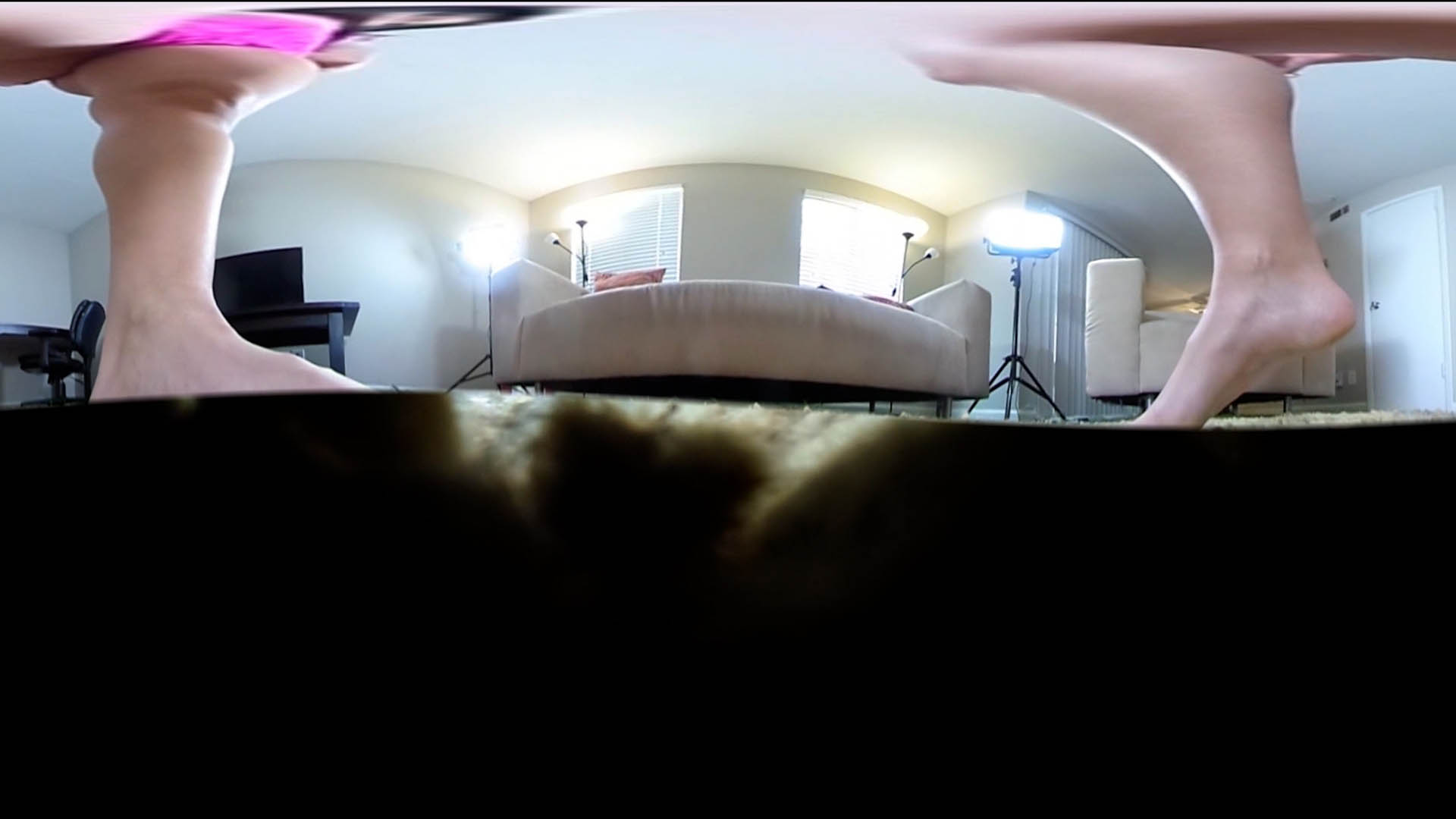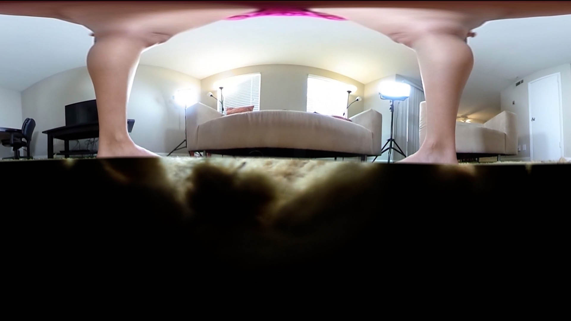 This is a purely voyeuristic perspective of giant woman Lucy Purr doing her daily exercise warmup routine. Your convenient size as a bug and spot on the fluffy carpet keeps you completely off her radar. You hold still as she stands right over you in her yoga pants and sports bra. She stretches arms overhead and then bends down to each side. Next she does her first set of squats over you followed by push-ups, before removing her pants down to her panties, and doing the same thing again. As she’s removing them, she is sure to hover her big feet over you for several moments. After she’s done her second set of squats and push-ups, she gets a phone call and absentmindedly keeps her foot directly above you, giving you a great view of all the fuzz and lint on her soles.