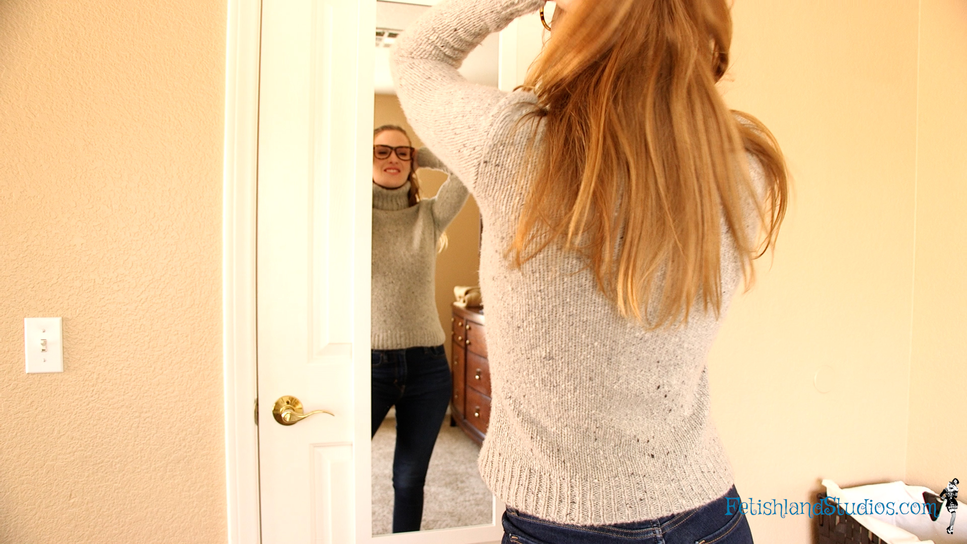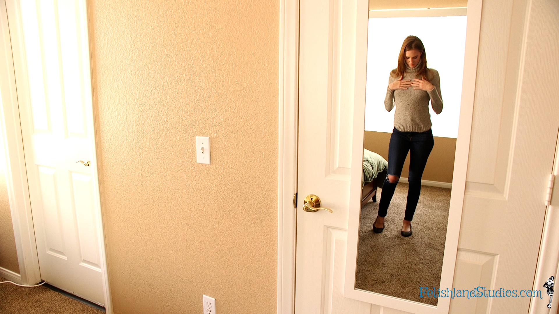 Ashley Lane sits up, gropes her crotch and explores her body. She looks around frantically, trying to discover where and who she is. She finds ID. She checks out house/apartment seeing if his body is there. She comments on how she moves differently and how clothes cling to her body. She catches a sight of her reflection, then finds a pair of glasses. She gropes her body more intently, dances a bit and poses sexy. She tapes off glasses and swaps sweaters, groping her chest in between. She continues to check herself out, rubbing her crotch and playing with her tits and hair. She hears a door open offscreen, looks in that direction and is surprised. She looks at camera, then shrugs shoulders.