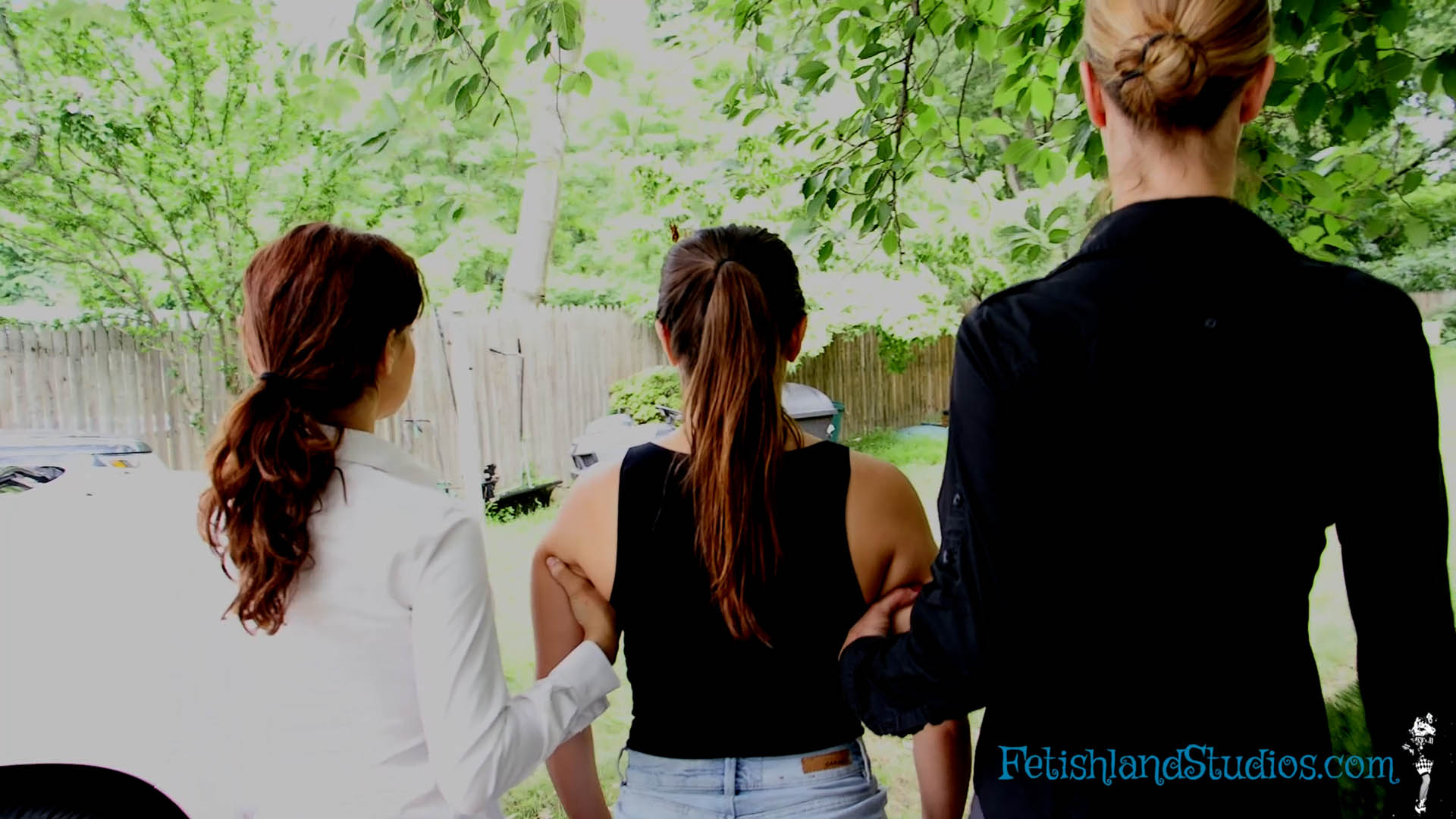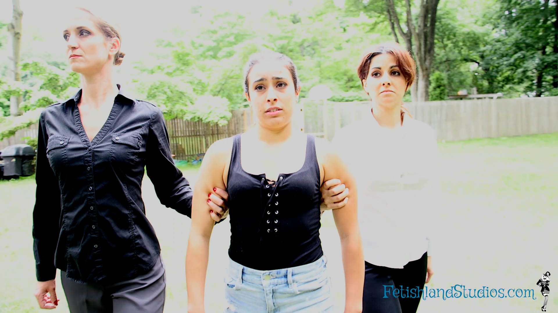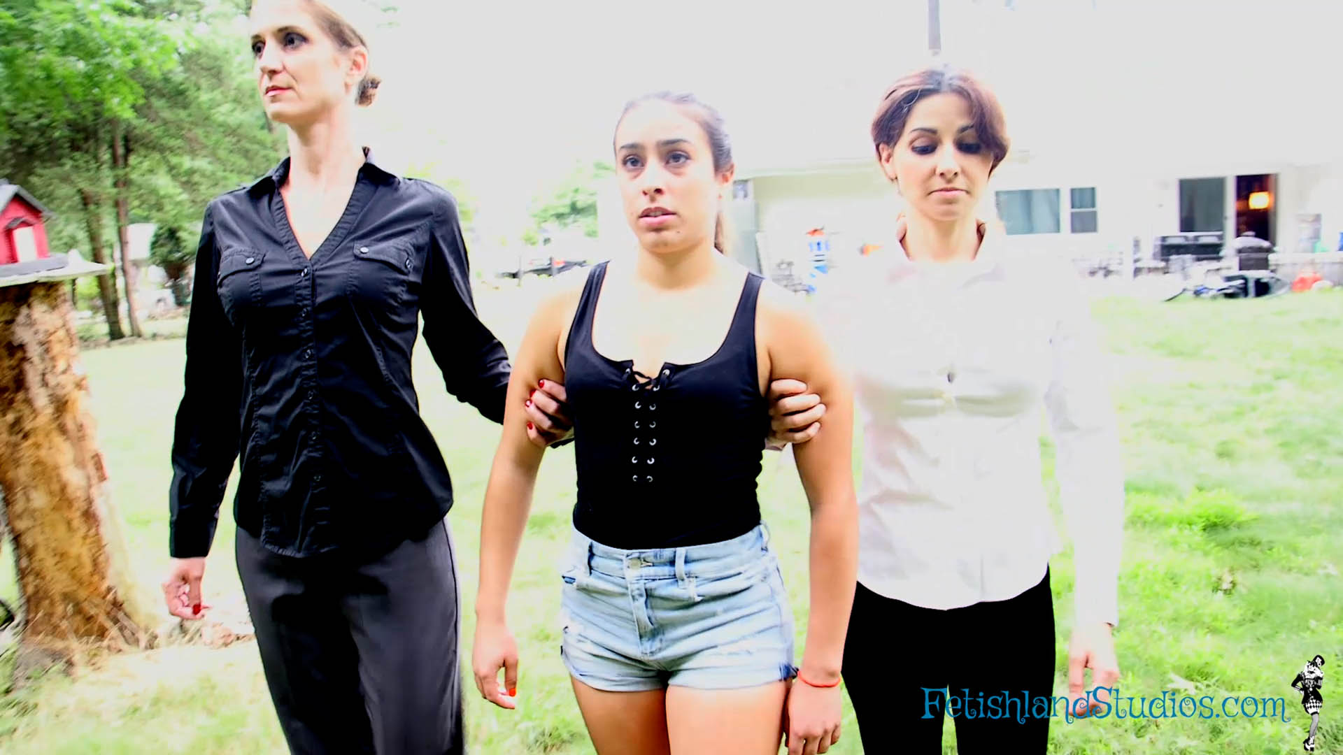 Sofia makes a phone call to let the other end know that she has a secured line and she is waiting to be transfered. Hannah Perez and Autumn Bodell knock on the door to let Sofia know that they are there to escort her and to tell her that she will be comppliant throughout the whole process. As they begin to walk, Hannah makes sure she has a tight hold on Sofia’s arm. Sofia asks if it has to be that tight. Hannah replies that she can make it tighter. They continue to walk through the house then outside. Sofia gets walked back inside and Hannah informs her that she is waiting on a clear. Hannah then gets a phone call that they have been compromised. Hannah tells Autumn that they have some work to do with Sofia. Hannah and Autumn begin to remove Sofia’s bottoms and shoe have to come off. They then begin to remove her top, Sofia is only in her bra and panties. Hannah handcuffs Sofia and then put a ball gag in Sofia’s mouth. Hannah tells Sofia to bend over the bed and begins to spank her. Once Hannah is done spanking Sofia, she removes the handcuffs and Autumn removes the ballgag. Then they begin to walk throughout the house and make their way outside again with Sofia still just in her bra and panties.