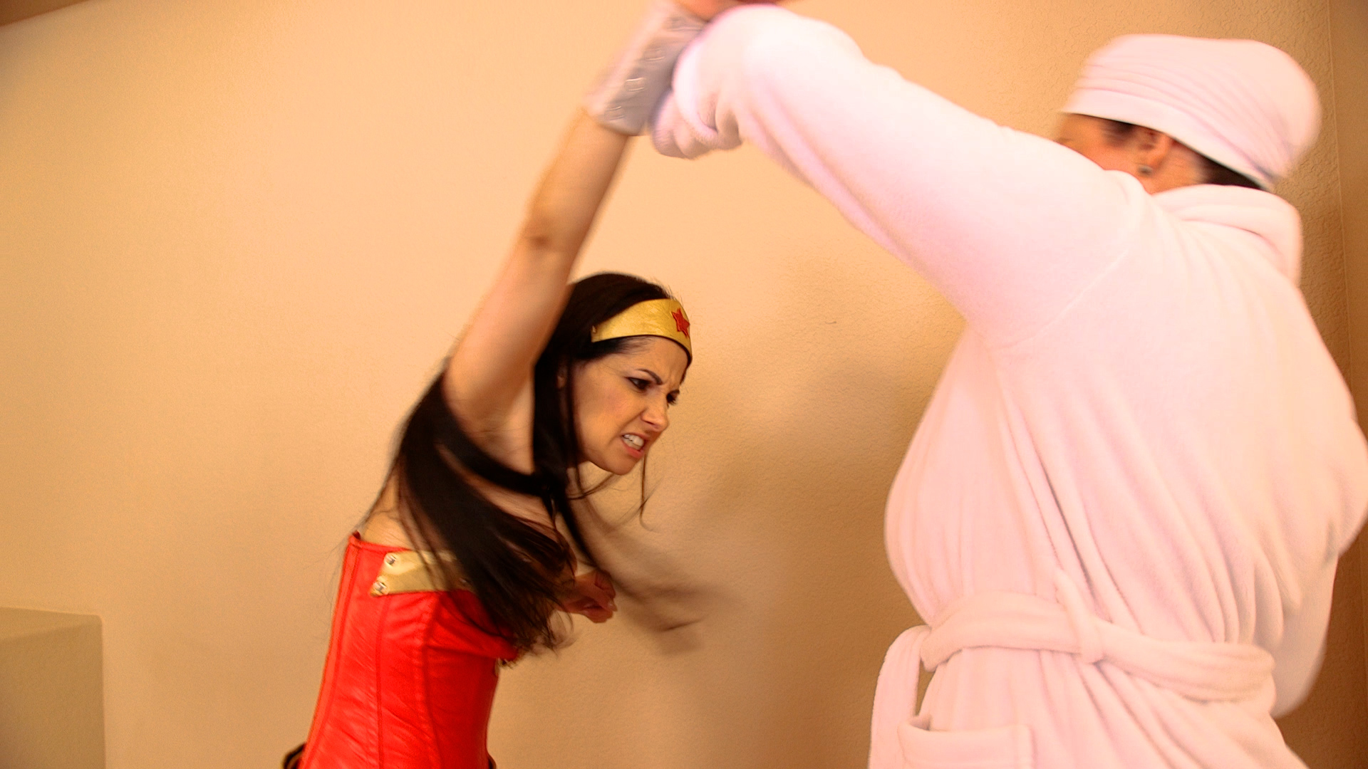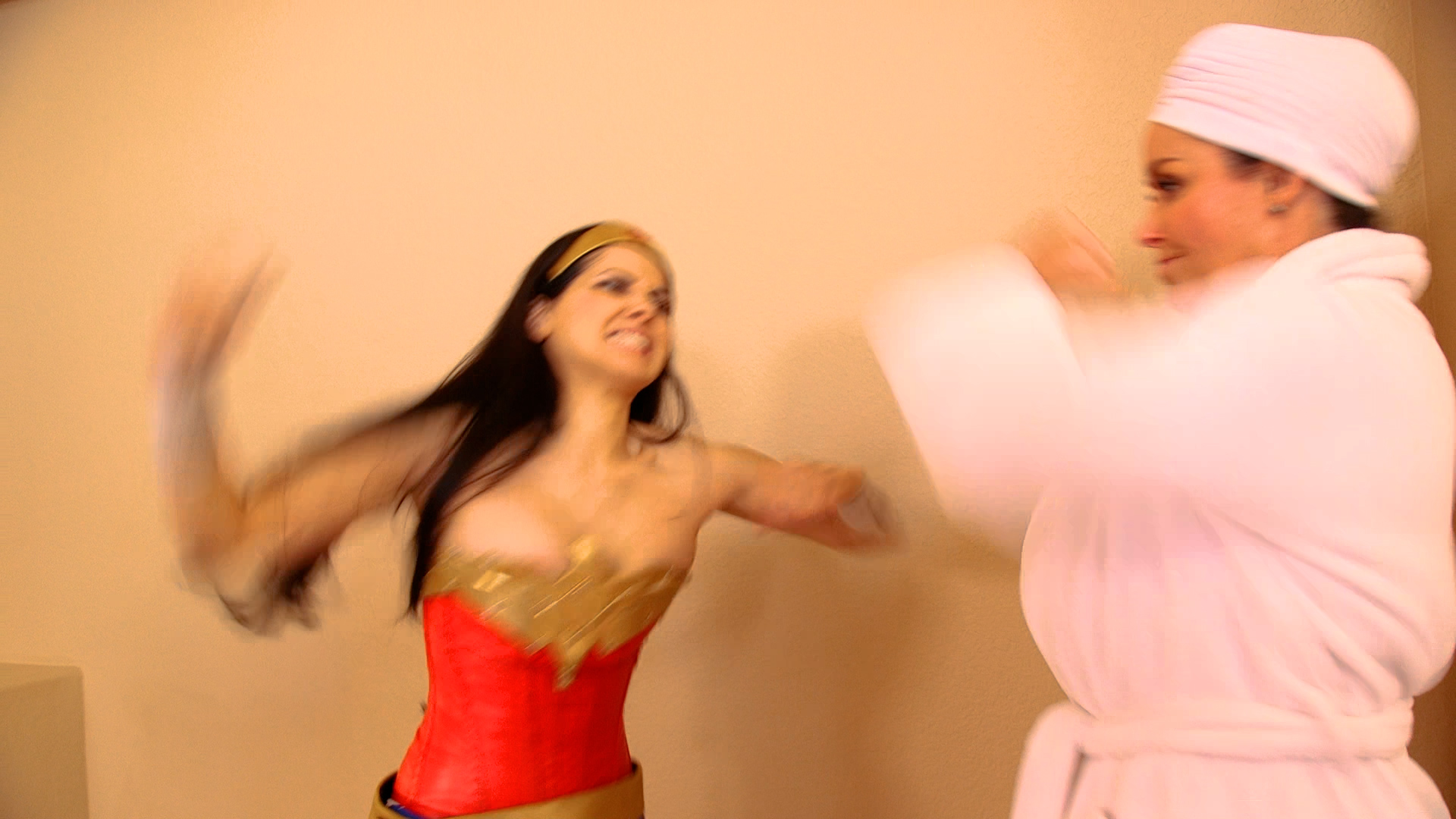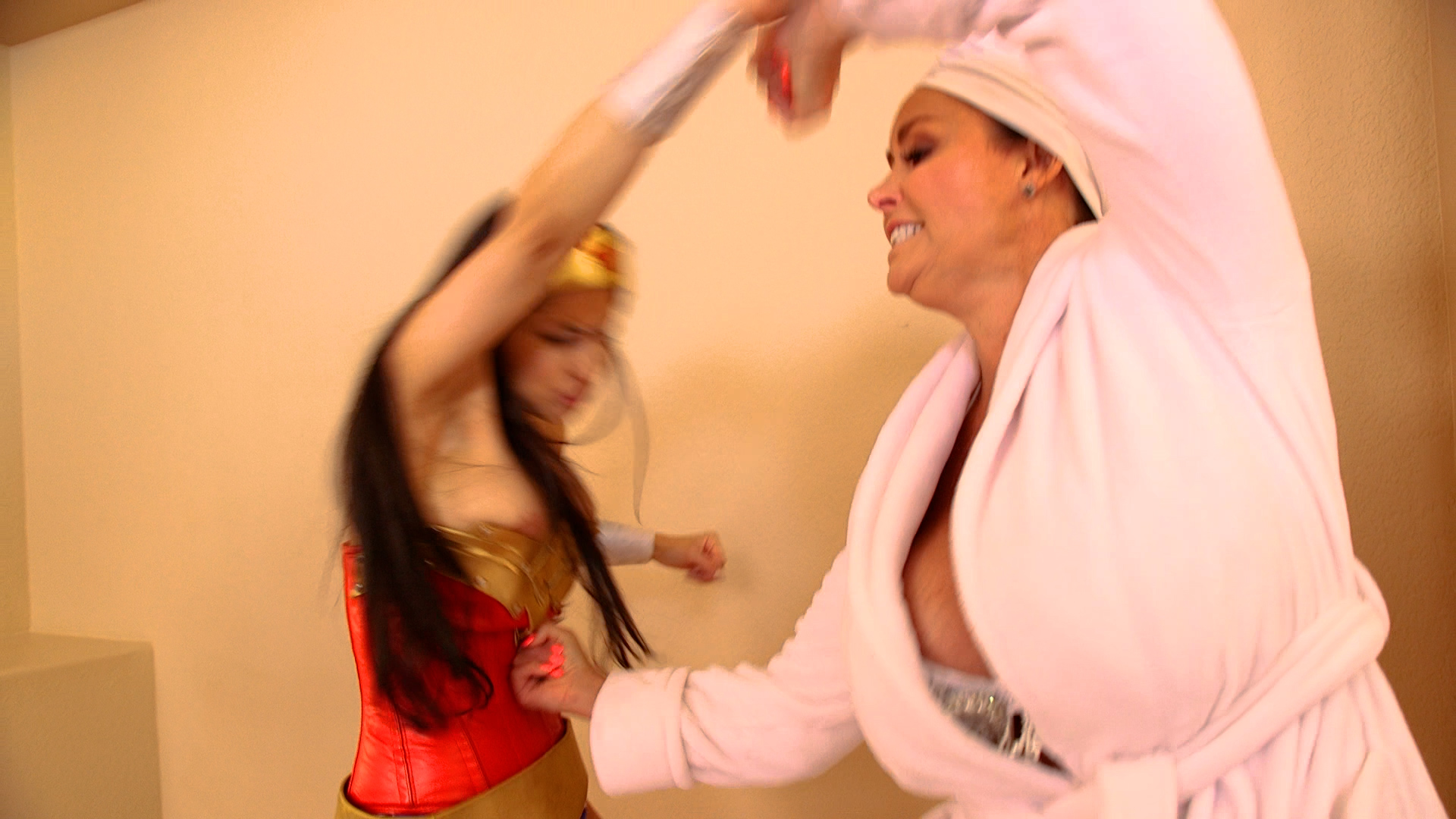 Hannah (as Wonder Hannah) encounters Christina (the Seductress). They talk trash and start fighting. Hannah tries catching Christina, who dodges Hannah’s attacks and mocks her. Hannah, tired, angry and worried about not catching Christina, stops and tries to recover. Christina lets bathrobe fall and reveals belly dance outfit, surprising Hannah with her beauty. Christina performs hypnotic belly dance. Hannah tries resisting but is hypnotized, going weaker and weaker. Hannah stands passively and aroused, Christina removes Hannah’s clothes (except tiara and bracelets), kissing her body and making Hannah aroused. When Christina tries removing Hannah’s tiara and bracelet, Hannah mentally fights back. Christina puts Hannah to sleep.