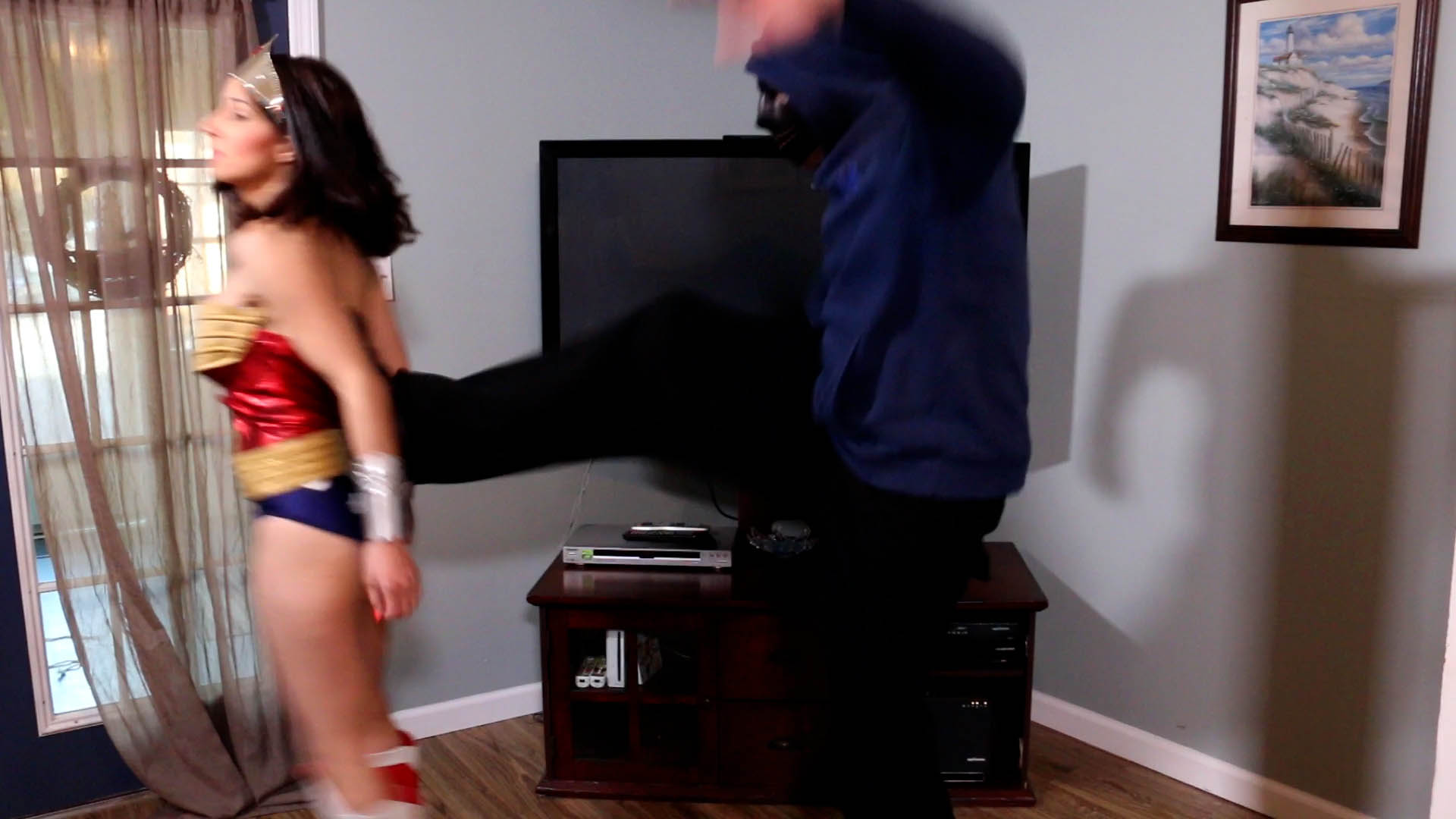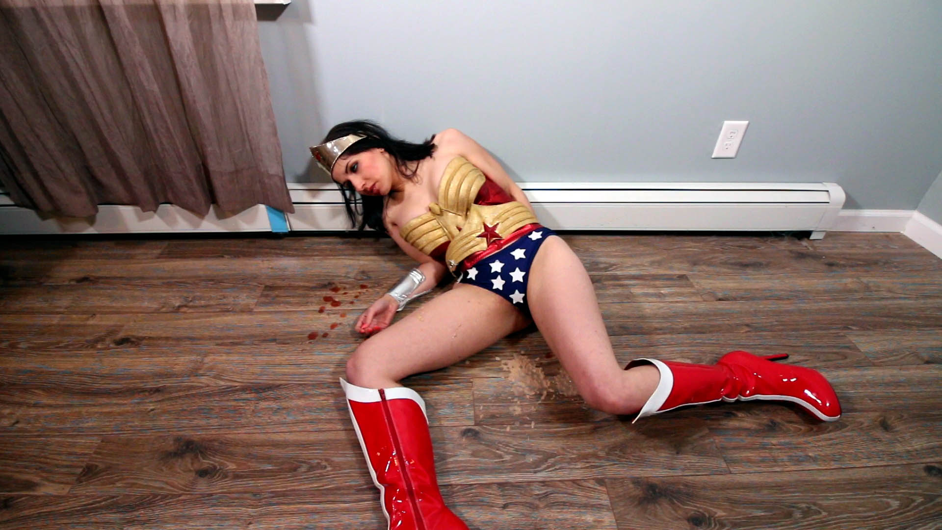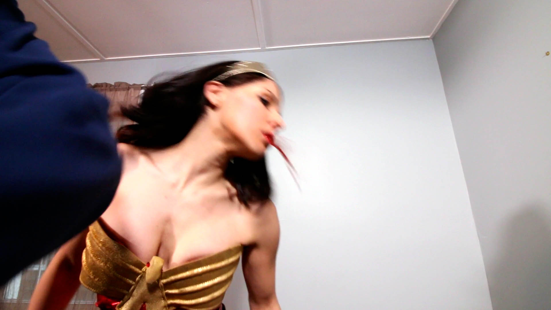Wonder Hannah Perez was wandered into the wrong place today. She arrives at a villain’s suspected hideout and she gets exactly what she’s asked for. Except, she doesn’t see it coming…when he catches her from behind with a kick to the back, which sends her flying forward onto the floor. She gets up and tries to make a comeback, but he catches her and punches her in the jaw. flies out. She is stunned! This gives him the chance to push her back up against the wall and begin a brutal belly punching beatdown! Punches are seen POV from the attacker, and great closeups of Hannah’s vomit and spit during the attack. Throughout the video she is stripped and forced to do an embarrassing topless shimmy. It is not a good day in WonderLand! Custom 2017 Featuring Hannah Perez