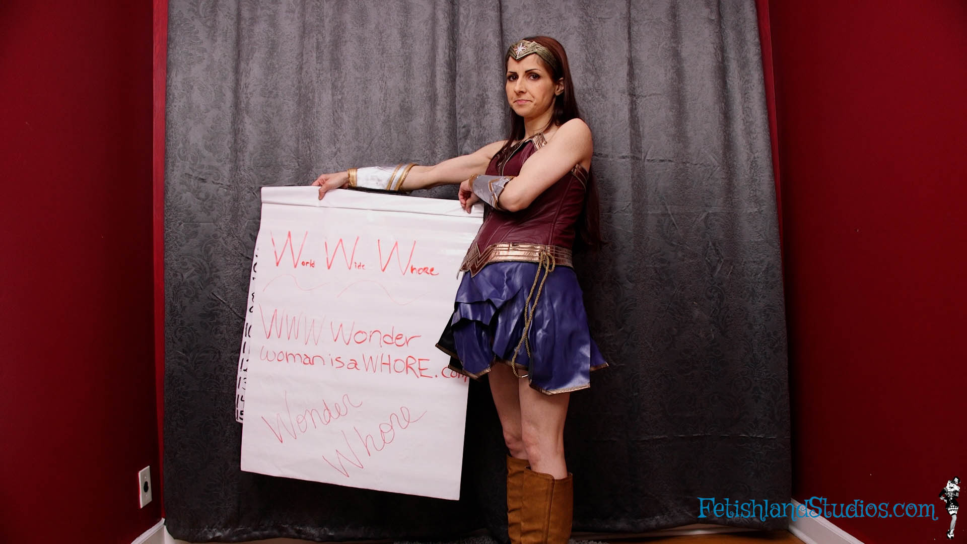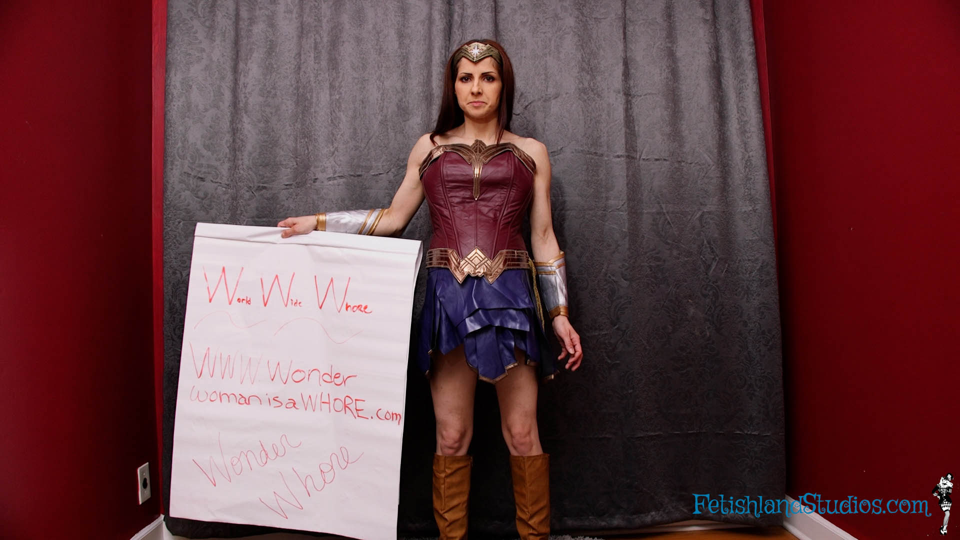 4KWonder Woman Hannah Perez decided to let loose one night with a man. Inviting him to her bedroom for a one night stand. Months down the line she appears to the world with a sign. World Wide Whore. Wonder Woman is a Whore. She got herself in this predicament with her one night stand. Her predicament is very noticeable. She is pregnant. And very ashamed. Wonder Hannah wants you to know that if you don’t stay abstinent that this could very well happen to you.