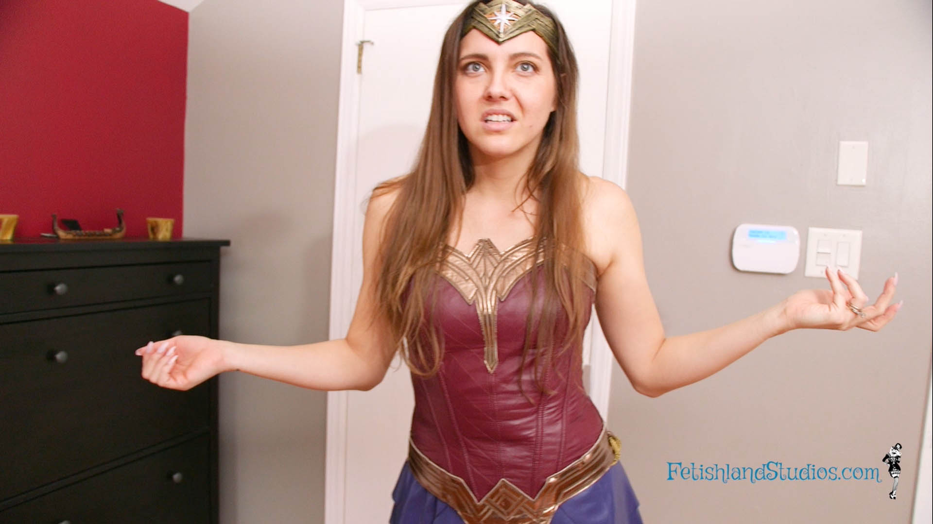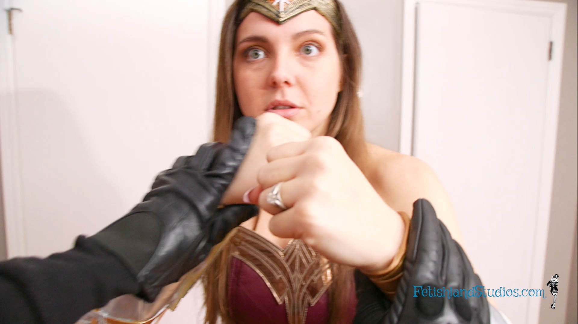 When Wonder Sadie Holmes is down to nothing but pantyhose and her tiara, you freeze her again, this time manipulating her body into different poses for fun.