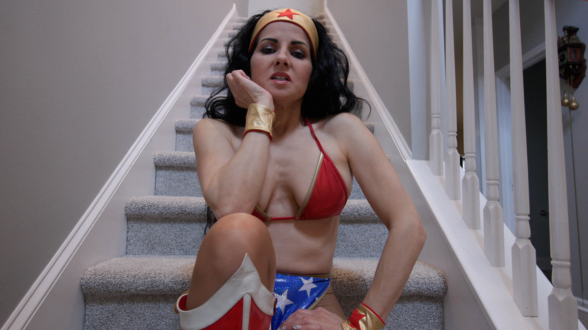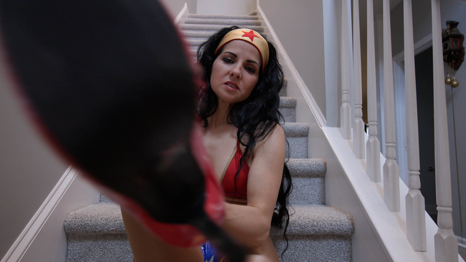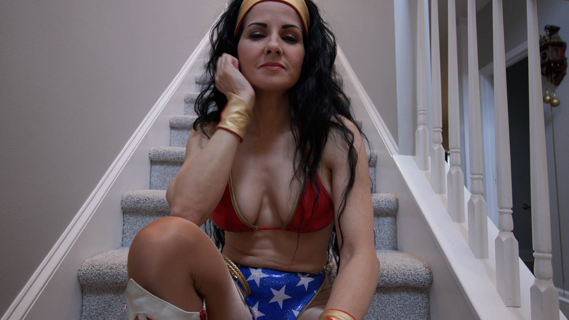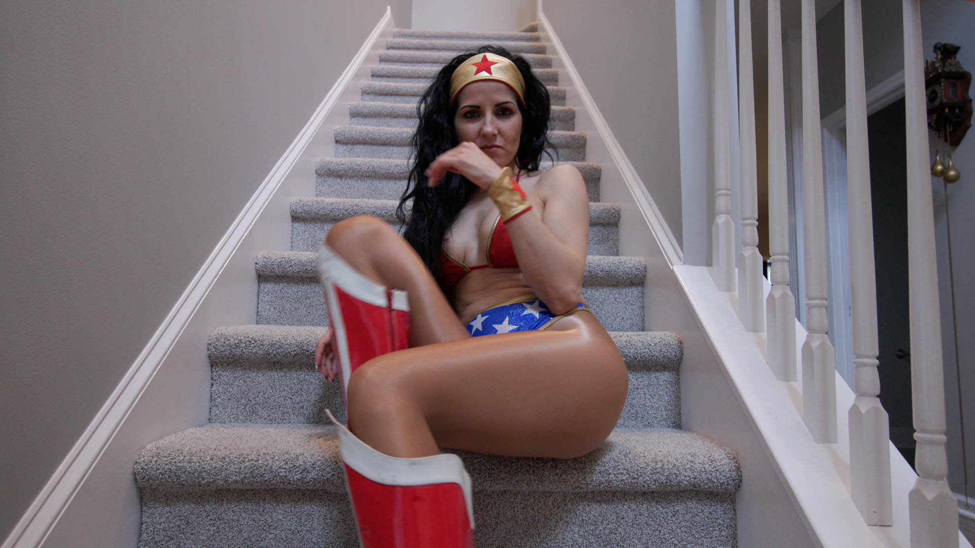 Wonder Woman has captured you (POV) and shows her dark side, by making you her captive and dominating you with her high heeled boots.