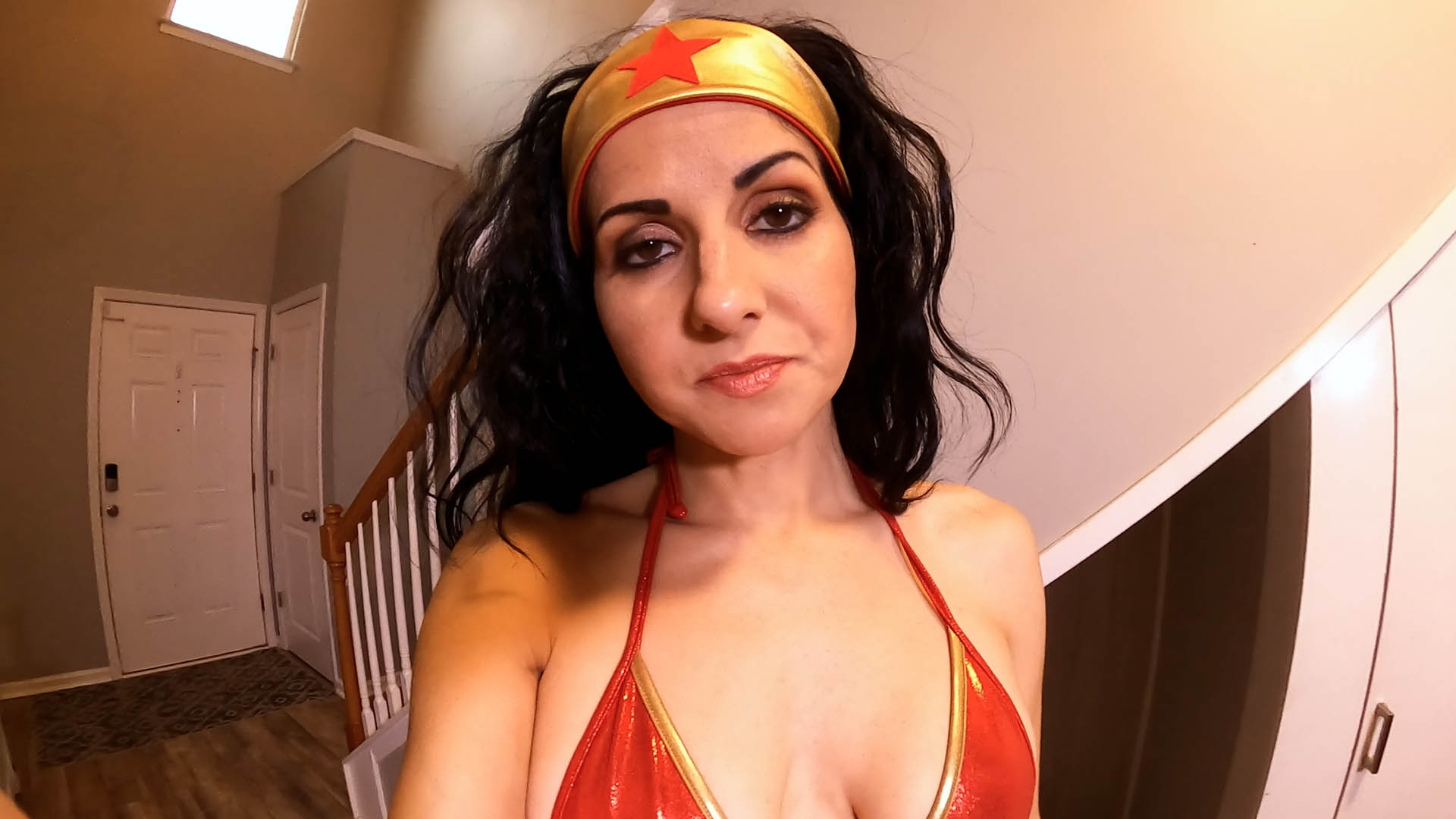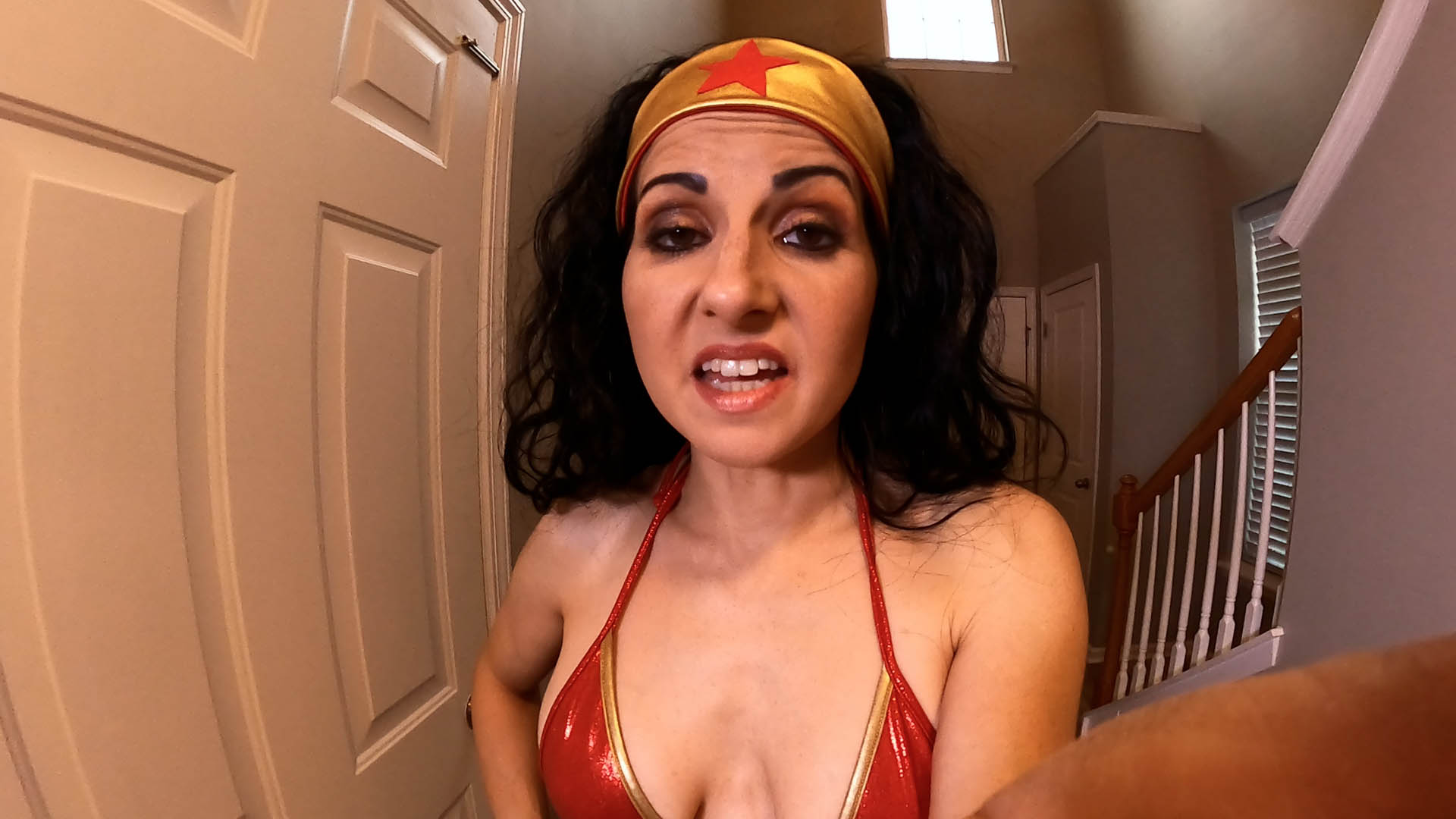 Wonder Woman (Hannah Perez) has caught you and shrunken you down. She teases and play with you like a prey with her food, before leaving you all alone, tiny and helpless.